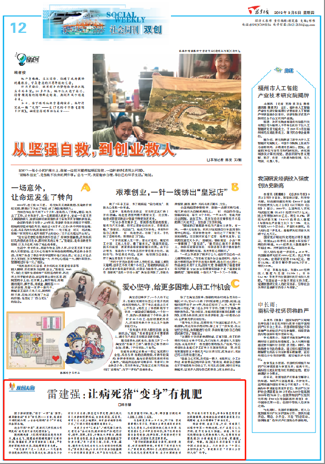 《福建日報》刊發(fā)“雷建強:讓病死豬變身有機肥”雙創(chuàng)人物專題報道 2019年09月05日