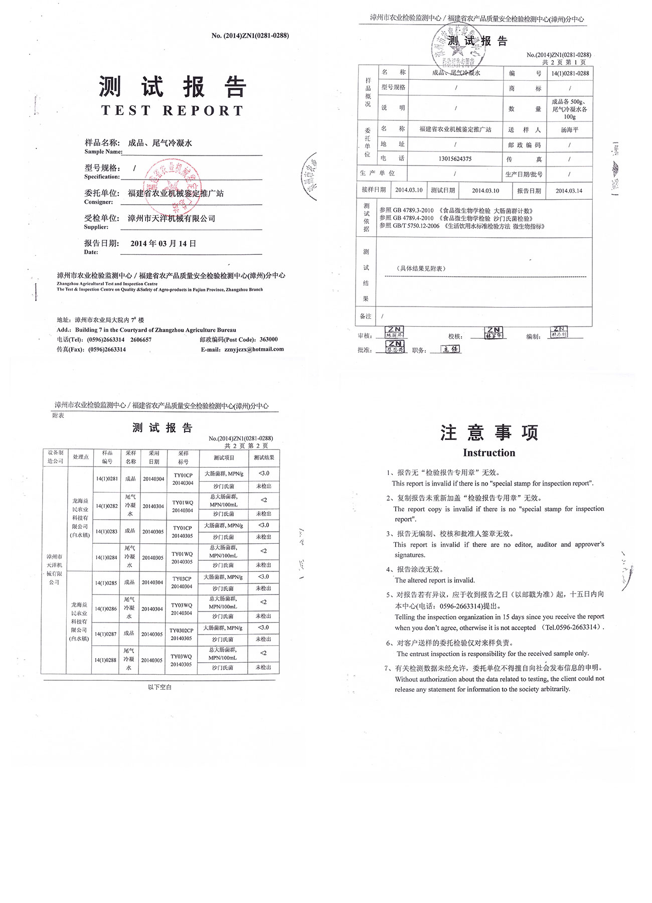 當(dāng)前位置: 首頁 > 產(chǎn)品介紹> 檢驗(yàn)報(bào)告漳州市農(nóng)業(yè)檢驗(yàn)監(jiān)測(cè)中心/福建省農(nóng)產(chǎn)品質(zhì)量安全檢驗(yàn)檢測(cè)中心(漳州)分中心測(cè)試報(bào)告--成品、尾氣冷凝水檢測(cè)